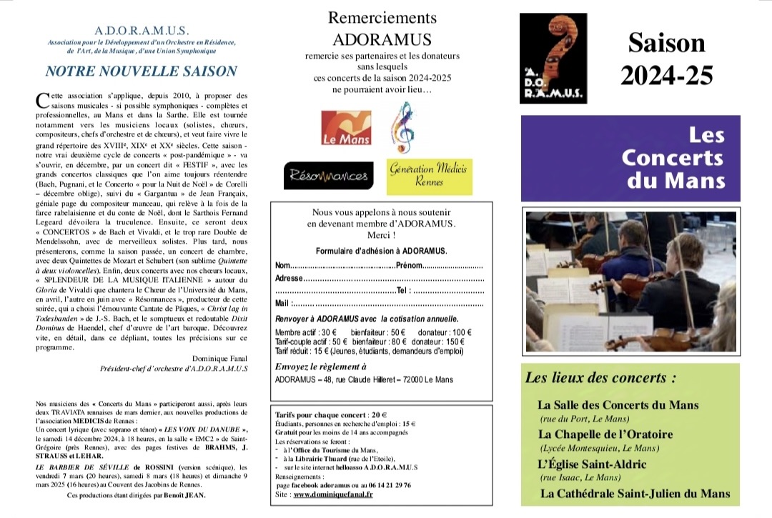 CALENDRIER 2025 cliquer pour agrandir SAMEDI 11 OCTOBRE 2025, 18 heures, LE MANS, Chapelle de l'Oratoire VIOLONS VIRTUOSES ! Direction : Dominique Fanal et Evelyne Béché Solistes : Vinh Pham, Aurelia Penalver-Smorawinska, Véronique Audoli, Elzbieta Lucas-Stolarz, Olivier Orient, Romain Renard, violons avec le concours de Gabriel Tempérault, piano (jeune pianiste sarthois) VIVALDI : « Le Printemps » et « L'Eté », extraits des « Quatre Saisons » Concerti pour 2 et 4 violons de « L'Estro Armonico » CHOPIN : Grandes pièces pour piano MASSENET : Le dernier Sommeil de la Vierge Méditation de Thaïs, pour violon et orchestre MOZART : Symphonie salzbourgeoise en fa majeur cliquer pour agrandir DIMANCHE 9 NOVEMBRE 2025, 16 heures, LE MANS, Salle des Concerts OMBRES ET LUMIÈRES Direction : Dominique Fanal Solistes : Valentina Diaz, piano - Diana Higbee, soprano K.-Ph.-E. BACH : Symphonie en si mineur MOZART : Concerto pour piano n° 23 Air de concert « Ch'io mi scordi di te », pour soprano, piano et orchestre CHAUSSON : Chanson perpétuelle, pour soprano, piano et cordes MILHAUD : Le Bœuf sur le Toit cliquer pour agrandir DIMANCHE 7 DÉCEMBRE 2025, 16 heures, LE MANS, Salle des Saulnières LES VOIX DE L'ÂME Direction : Dominique Fanal Solistes : Mireille Delunsch, soprano - Luc Orsini, hautbois - Vinh Pham, violon J.-S. BACH : Concerto pour violon et hautbois ALBINONI : Concerto pour hautbois MOZART : Air de concert « Non piu tutto ascoltai », pour soprano, violon et orchestre Jean FRANCAIX : Six Préludes pour cordes HAYDN : Cantate « Ariane à Naxos », pour soprano et orchestre cliquer pour agrandir DIMANCHE 8 FÉVRIER 2026, 18 h LE MANS, Chapelle de l'Oratoire MUSIQUE DE CHAMBRE Jeffrey Nau, piano - Vinh Pham, violon - Claudine Christophe, alto Olivier Ledru, violoncelle - Mauricio Romero, contrebasse BEETHOVEN : Sonate pour violon et piano « Le Printemps » MYASKOWSKY : Sonate pour violoncelle et piano n° 1 SCHUBERT : Quintette « La Truite »