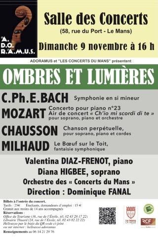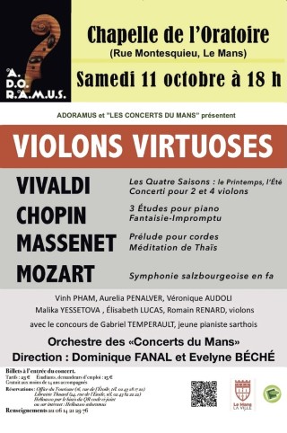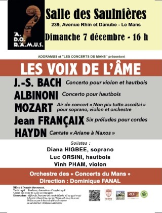 CALENDRIER 2025 cliquer pour agrandir   SAMEDI 11 OCTOBRE 2025, 18 heures,  LE MANS, Chapelle de l'Oratoire  VIOLONS VIRTUOSES !  Direction : Dominique Fanal et Evelyne Béché  Solistes : Vinh Pham, Aurelia Penalver-Smorawinska, Véronique Audoli,  Elzbieta Lucas-Stolarz, Olivier Orient, Romain Renard, violons  avec le concours de Gabriel Tempérault, piano (jeune pianiste sarthois)    VIVALDI : « Le Printemps » et « L'Eté », extraits des « Quatre Saisons »  Concerti pour 2 et 4 violons de « L'Estro Armonico »  CHOPIN : Grandes pièces pour piano  MASSENET : Le dernier Sommeil de la Vierge Méditation de Thaïs, pour violon et orchestre  MOZART : Symphonie salzbourgeoise en fa majeur    cliquer pour agrandir   DIMANCHE 9 NOVEMBRE 2025, 16 heures,  LE MANS, Salle des Concerts  OMBRES ET LUMIÈRES  Direction : Dominique Fanal  Solistes : Valentina Diaz, piano - Diana Higbee, soprano    K.-Ph.-E. BACH : Symphonie en si mineur  MOZART : Concerto pour piano n° 23  Air de concert « Ch'io mi scordi di te », pour soprano, piano et orchestre  CHAUSSON : Chanson perpétuelle, pour soprano, piano et cordes  MILHAUD : Le Bœuf sur le Toit  cliquer pour agrandir   DIMANCHE 7 DÉCEMBRE 2025, 16 heures,  LE MANS, Salle des Saulnières  LES VOIX DE L'ÂME  Direction : Dominique Fanal  Solistes : Mireille Delunsch, soprano - Luc Orsini, hautbois - Vinh Pham, violon    J.-S. BACH : Concerto pour violon et hautbois  ALBINONI : Concerto pour hautbois  MOZART : Air de concert « Non piu tutto ascoltai »,  pour soprano, violon et orchestre  Jean FRANCAIX : Six Préludes pour cordes  HAYDN : Cantate « Ariane à Naxos », pour soprano et orchestre